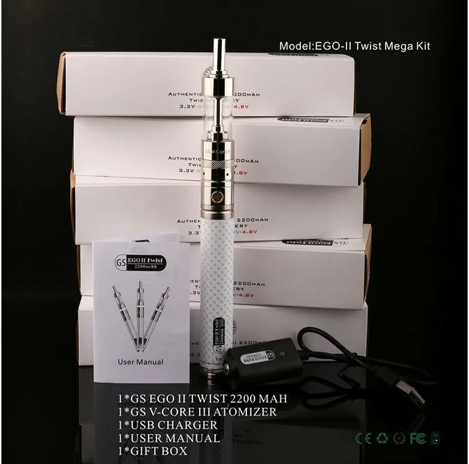 Main Features : Newest Portable Vaporizer e cigarette GS eGo II Twist Mega Kit Carbon fiber 2200mah eGo twist battery Electronic Cigarette